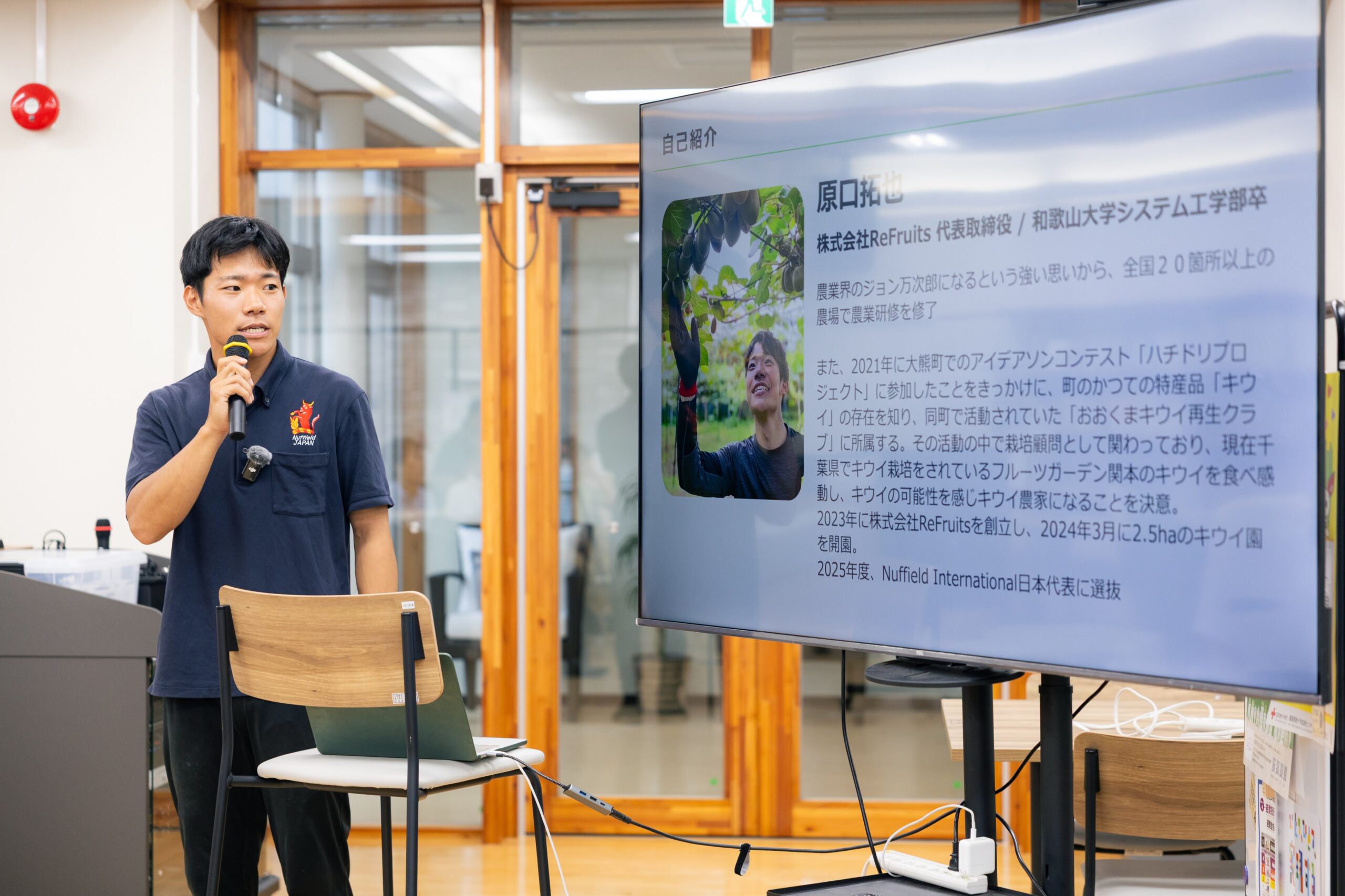 入居企業・株式会社ReFruitsの代表 原口拓也さんが、農業リーダー育成プログラム「Nuffield Japan」に参加した成果を共有する報告会を開催しました。