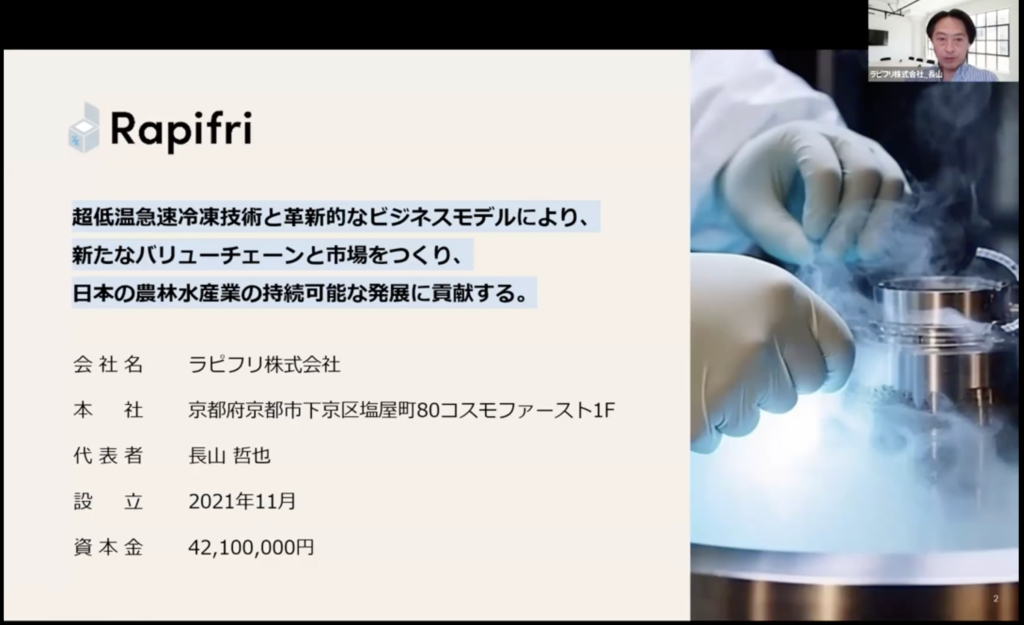 ・マイナス50℃の液体瞬間凍結技術を活用し、高鮮度冷凍食品の開発を軸に事業を展開しているラピフリ株式会社