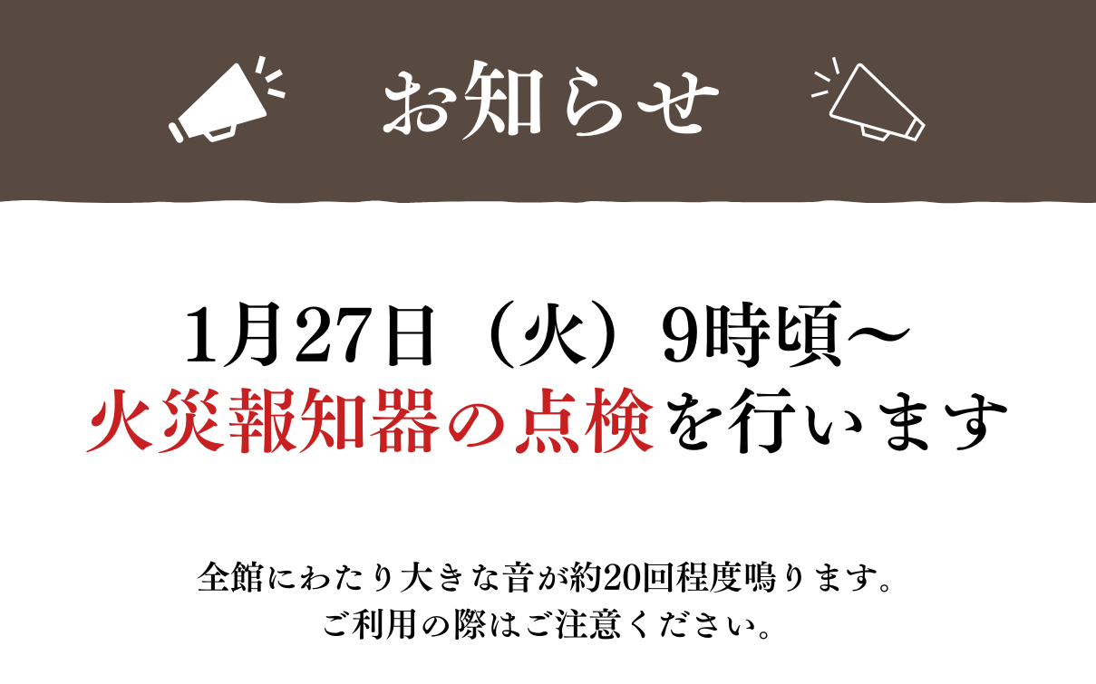 1月27日(火)9時以降午後頃まで、館内にて火災報知器の点検を実施いたします。