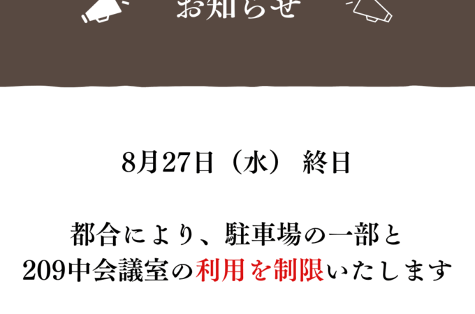 平素よりOICをご利用いただきありがとうございます。 都合により、駐車場の一部と209中会議室の利用を制限いたします。 【入居企業の皆さまへ】 ・各種...